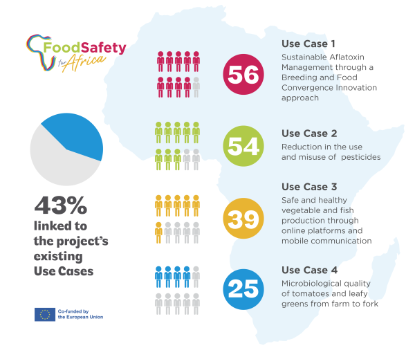 Among the proposals tied to FS4Africa’s Use Cases, Use Case 1 – Sustainable Aflatoxin Management through a Breeding and Food Convergence Innovation approach received the highest engagement, representing 32% of Use Case-linked proposals, followed by Use Case 2 – Reduction in the use and misuse of pesticides (31%), Use Case 3 – Safe and healthy vegetable and fish production through online platforms and mobile communication (22%), and Use Case 4 – Microbiological quality of tomatoes and leafy greens from farm to fork (14%).